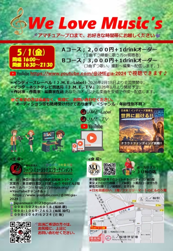 ✴2024年2月14日設立の『一般社団法人ジャパンミュージックエンターテインメント』としては、一緒に歩む「中目黒TRY」、提携した「AJACA 全日本音楽著作家協会」、そして「ANNEX CLUB」とも提携して、弊社のみならず、創業期から誓い合った「Mingeki(ミンゲキ) 代表;風間 智さん」と全国制覇(手前の目標は10万人登録ですが…)の目標に向かって歩調を早めて参ります。